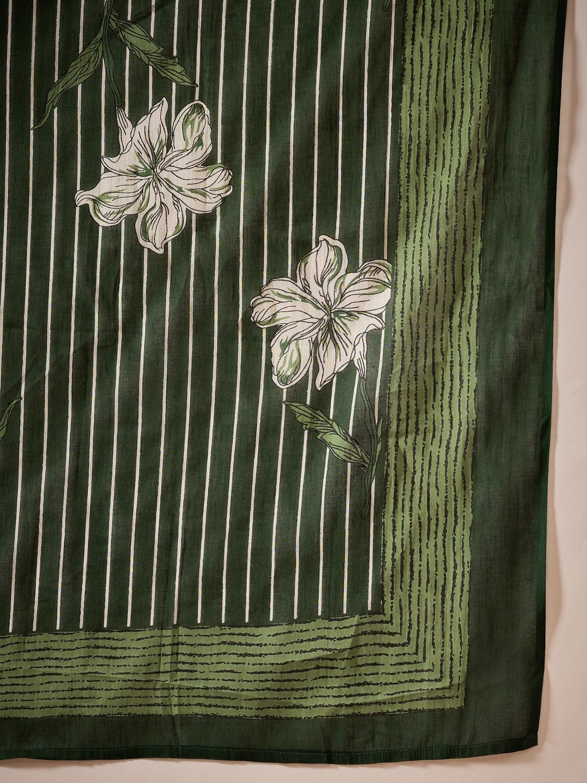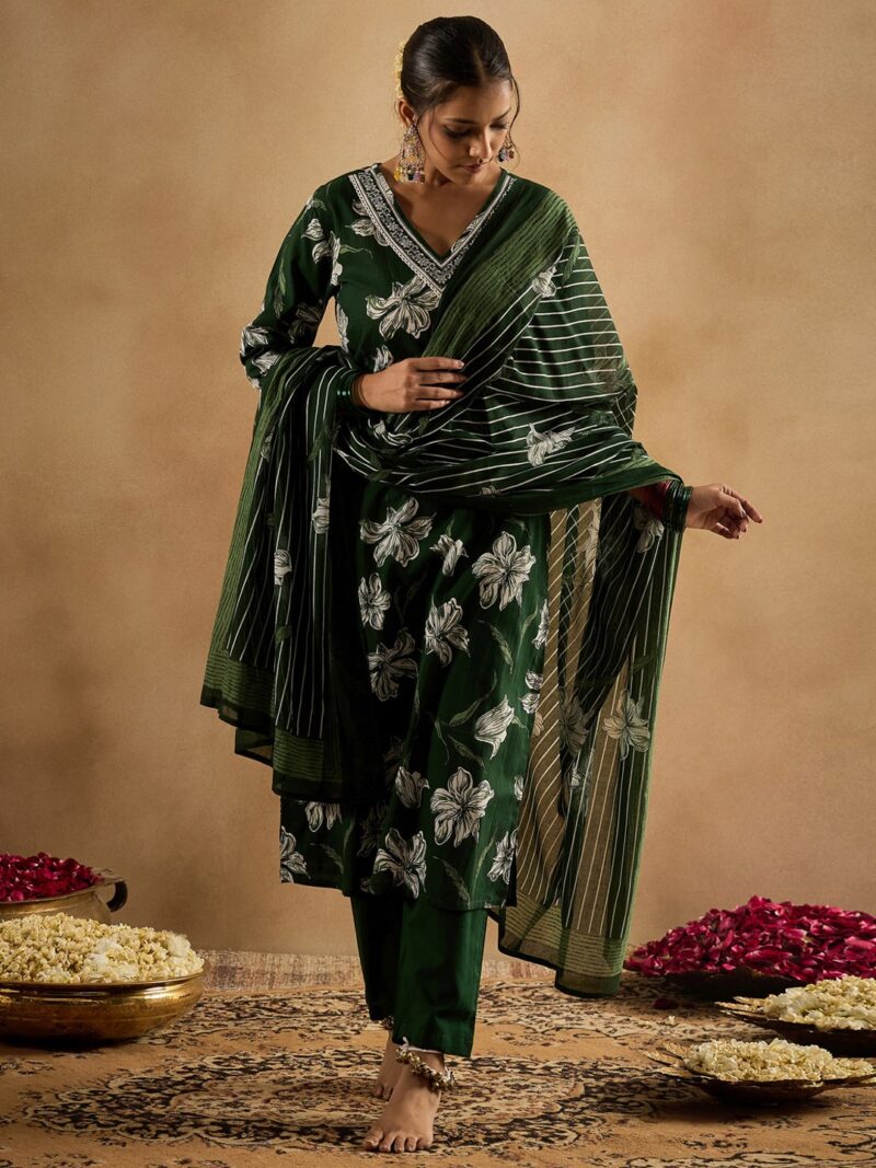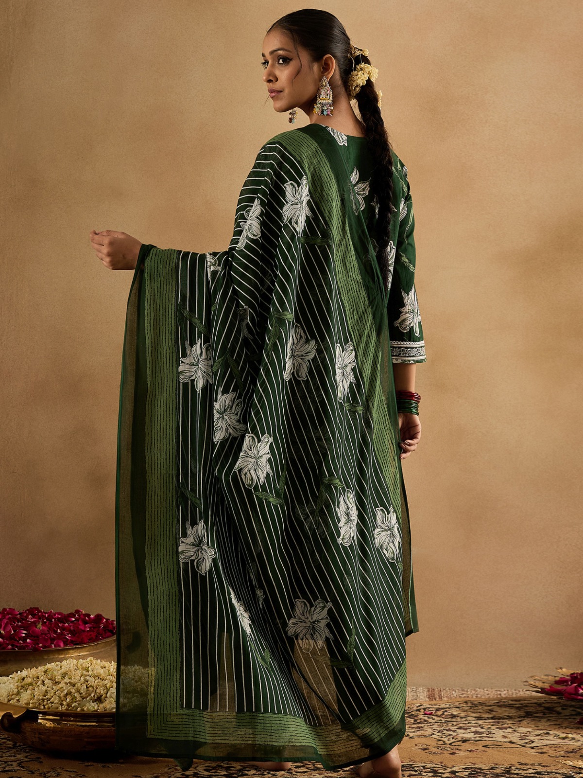 Dark Green Floral Pure Cotton Kurta With Trousers & Dupatta